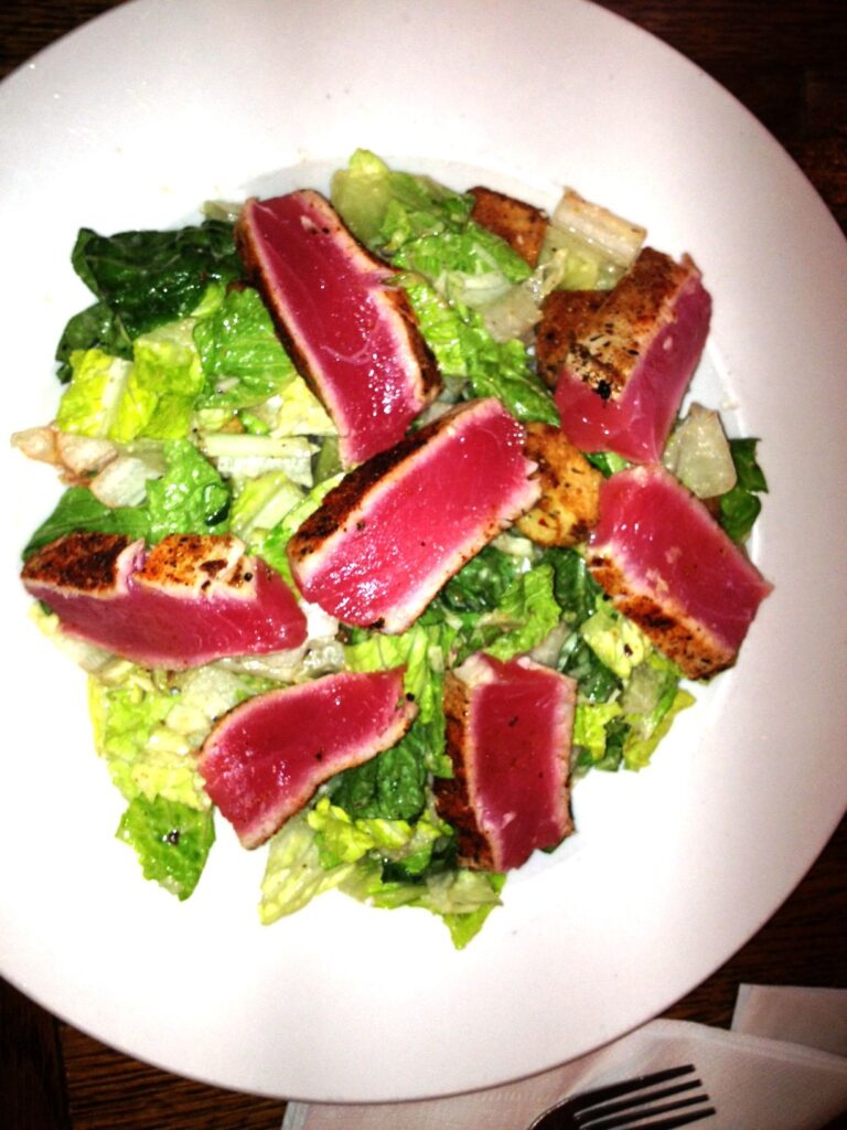 What a nice Friday for lunch at Proud Larrys’, where a Bloody Mary paired nicely today with the Blackened Tuna Caesar. It’s yellowfin tuna served rare over, you guessed it, Caesar salad, priced at $10.95.