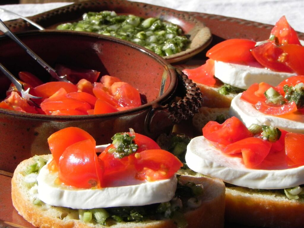Spread basil mixture over bread. Top each slice with about 1 T of diced tomatoes. Add a thin slice of mozzarella, and top the cheese with a spoonful of basil mixture and tomatoes. VARIATION: When preparing to serve immediately, go ahead and combine diced tomatoes with the basil mixture.