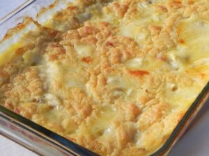 VARIATION: Cook up fresh, diced carrots and fresh or frozen green peas; toss with the shredded chicken before layering in the pan.