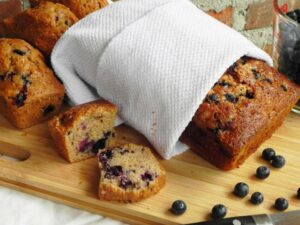 Beat the eggs in a large mixing bowl. Add oil, sugar, and vanilla extract. Stop mixer and fold in zucchini. Beat well, and beat in the dry ingredients in two parts until completely blended. Gently fold in blueberries. Pour into bread pan and four mini-loaf pans or two small-loaf pans (there’s not enough batter to fill two large bread pans). Place on middle rack in medium-hot oven and bake 50-60 minutes, or until toothpick inserted in center comes out clean. Cool on rack for 20 minutes. Run knife blade around edges, and turn out onto wax paper (on sides) to finish cooling.