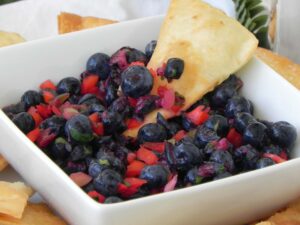 The Old Bride has made it a game to see how many ways blueberries can be consumed each week. Of course, they are an excellent topping on a yogurt parfait or a bowl of cereal. A handful of blueberries make an excellent pick-me-up snack –more satisfying than those evil chips or chocolate kisses. And there are numerous ways to incorporate them into salsas, beverages, sauces, soups, and salads to complement an entire meal.