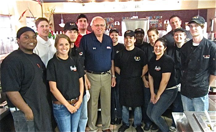 Don Newcomb (front, in blue shirt) and the crew at the original Newk’s location on University Avenue.