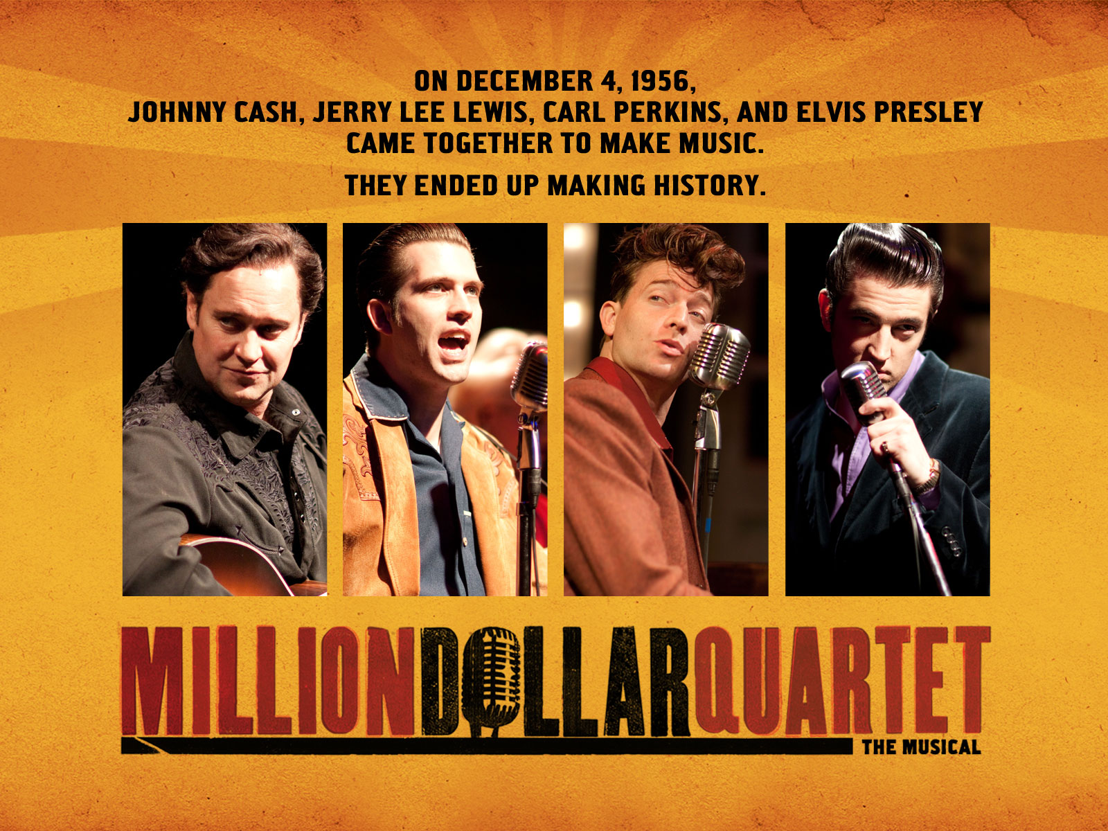 The Tony Award-winning Broadway musical, Million Dollar Quartet,is inspired by the electrifying true story of the famed recording session that brought together rock ’n’ roll icons Elvis Presley, Johnny Cash, Jerry Lee Lewis and Carl Perkins for the first and only time. On December 4, 1956, these four young musicians were gathered together by Sam Phillips, the “Father of Rock ’n’ Roll,” at Sun Records in Memphis for what would be one of the greatest jam sessions of all time. Million Dollar Quartet brings that legendary night to life with an irresistible tale of broken promises, secrets, betrayal, humorous banter and celebrations, featuring timeless hits including “Blue Suede Shoes,” “Ring of Fire,” “That’s All Right,” “Sixteen Tons,” “Great Balls of Fire,” “I Walk the Line,” “Whole Lotta Shakin’ Goin’ On,” “See Ya Later, Alligator,” “Fever,” “Folsom Prison Blues,” “Hound Dog” and more.