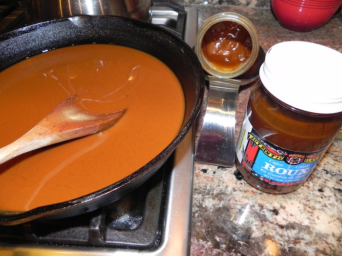 If using jarred roux, stir one cup into 2 to 3 c of boiling chicken stock until blended. Keep warm until ready to use.