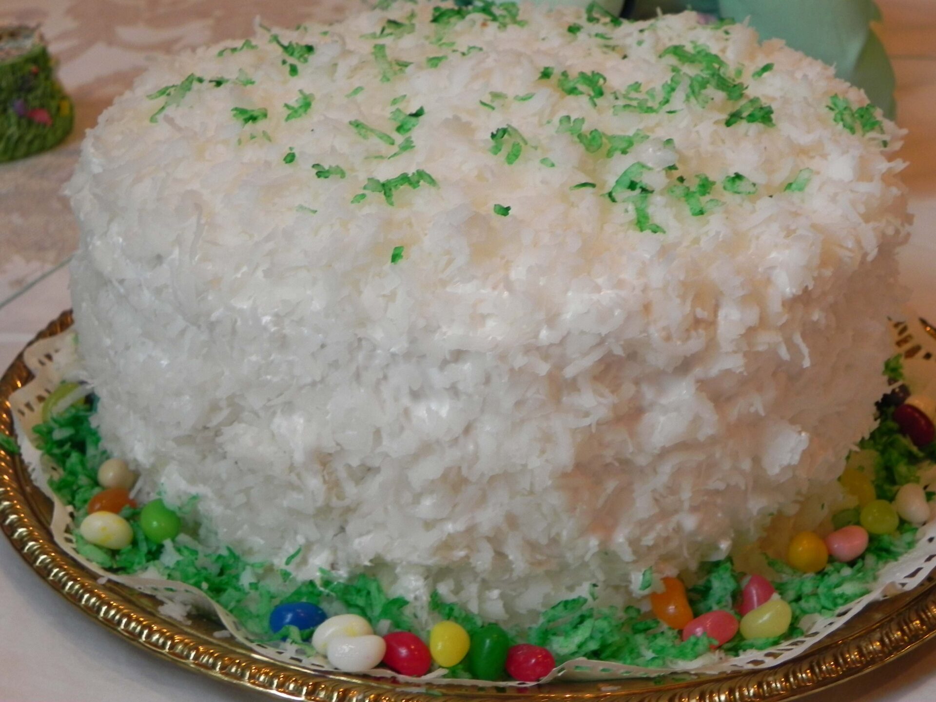 Slather top and sides of cake with Seven Minute icing, working quickly before the icing sets up (it becomes like a marshmallow). Sprinkle coconut over top and along sides. Refrigerate cake until ready to serve.