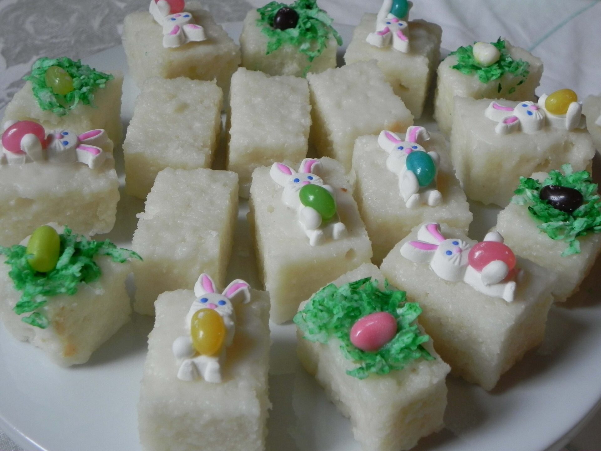 Before icing sets up, decorate tops of cakes with candy flowers or bunnies; or make a small birds nest on top with a sprinkle of coconut and a jelly bean. NOTE: Color the coconut with 3 drops of green food coloring and allowed it to dry before handling.
