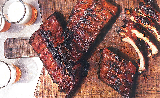I want to cook the ribs as close to 225 degrees as possible. After I have added the charcoal to the smoker, I add a chunk of hickory or pecan and a chunk of fruit wood. I also make sure that I have a pan of water above or beside the coals to add moisture to the cooking environment. A trick I picked up from a Memphis in May World Champion is to add halved heads of garlic and onions to the coals for another layer of flavor.