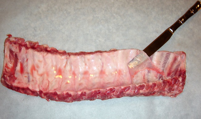 The first step in prepping the ribs is removing the membrane on the bone side of the ribs. It’s easier than it might sound. I insert a butter knife under the membrane along a bone, careful not to tear it, about an inch or so and lift slightly without tearing it. Now, I wrap a paper towel around my index and middle fingers to help grab the membrane and pull it off slowly. If there is excess fat on the ribs, I trim some of it, but I’ll leave some because it provides a lot of flavor.