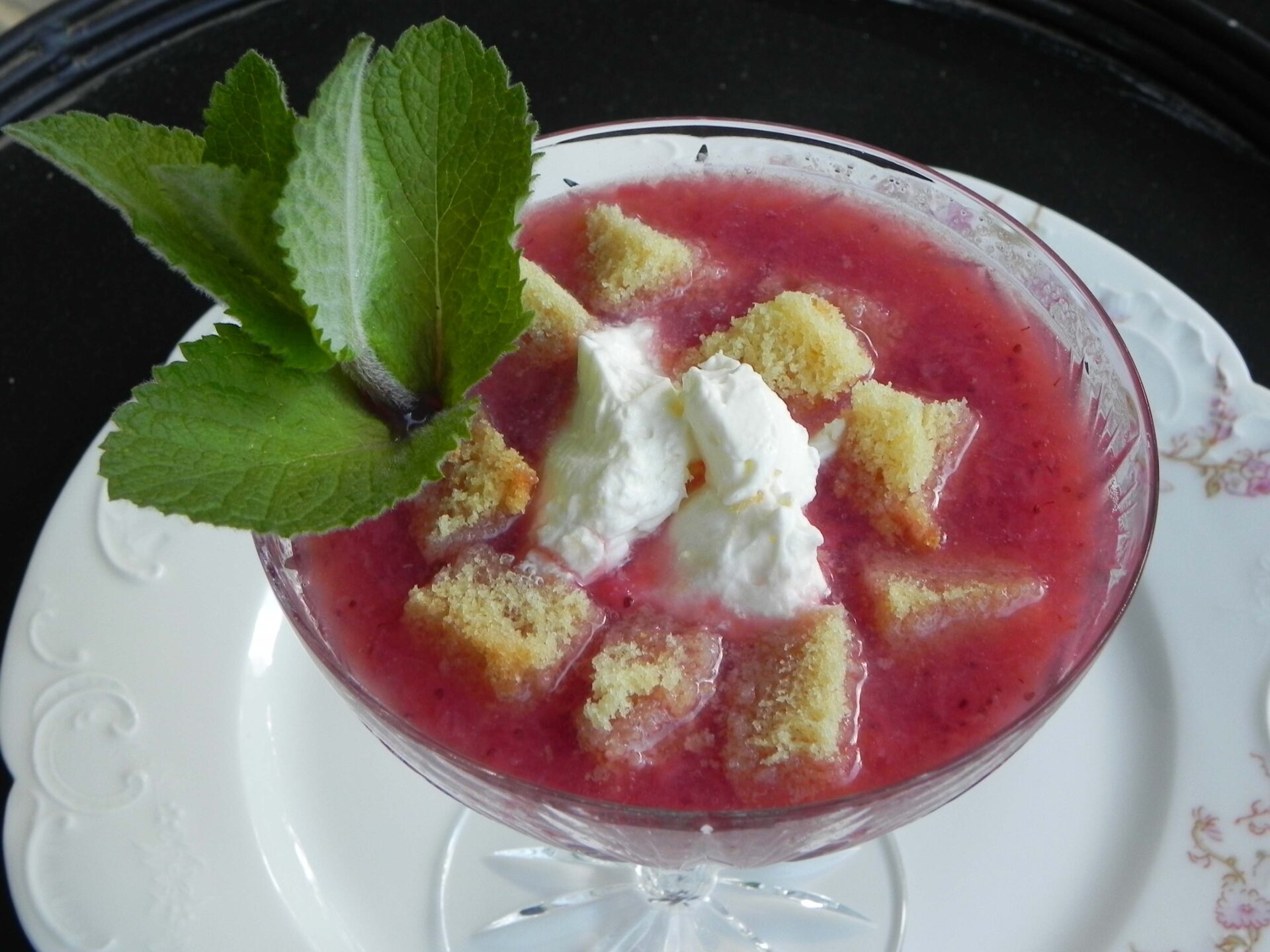 When ready to serve the soup, ladle or pour the soup into 4 teacups or dessert bowls. Dollop some of the mascarpone cream topping on each, and scatter toasted croutons around the cream. Garnish each dish with a strawberry or a sprig of fresh mint.