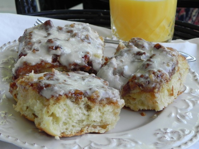 Sis-in-law Andrea got this tasty breakfast roll recipe from her stepson-in-law, Ed Hume. Under Andrea’s guidance, I made up the recipe in the evening and allowed the rolls to rise overnight, baking them for breakfast to serve with bacon or sausage. I won’t indulge often, but when I do, I will consider these very sweet rolls to be healthful due to the honey.