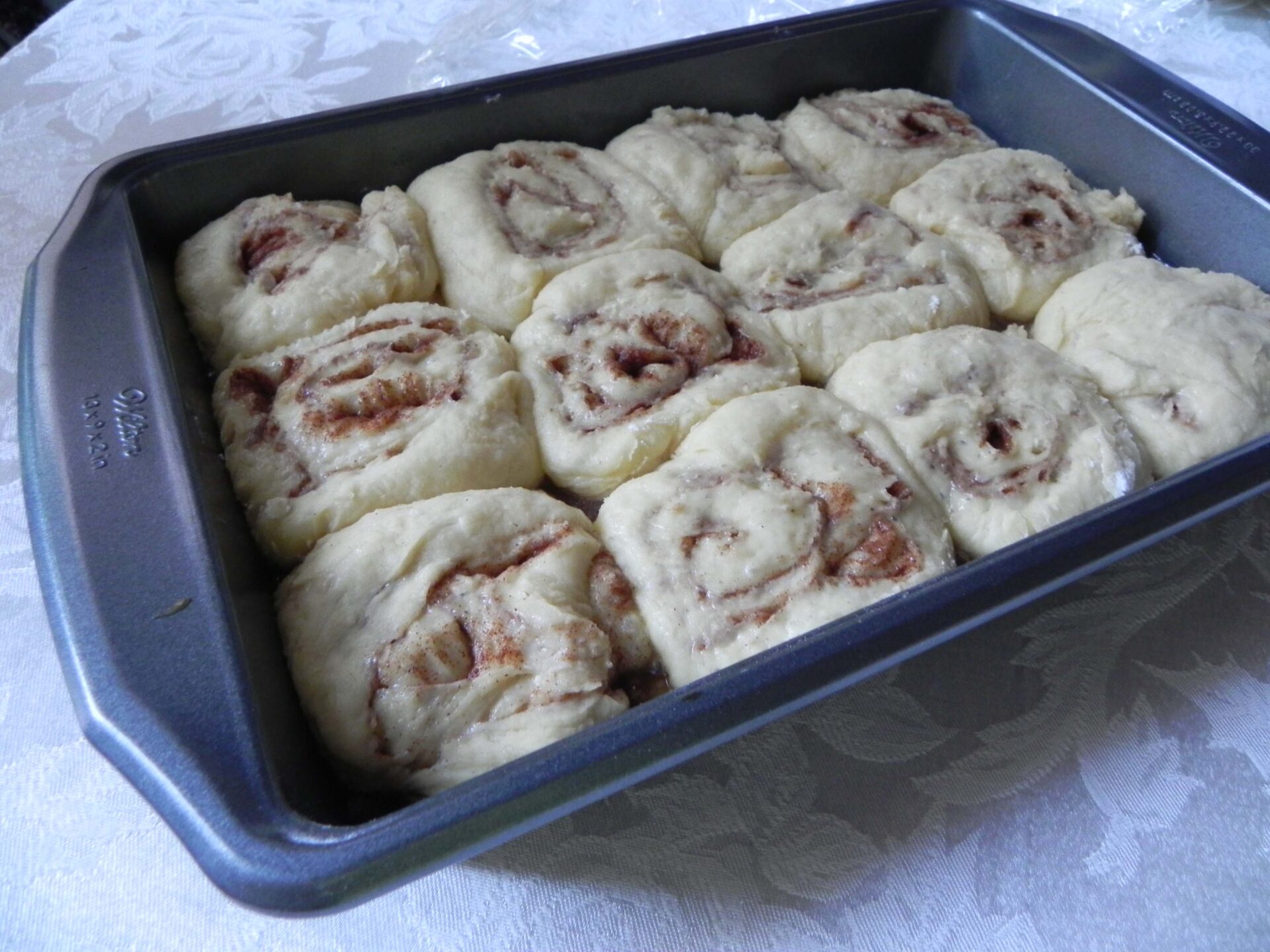 Once rolled, measure off 12 even slices and cut the slices. Position four rows of 3 three slices in the pan on top of the hardened syrup. Don’t worry that the unbaked rolls are not touching each other.