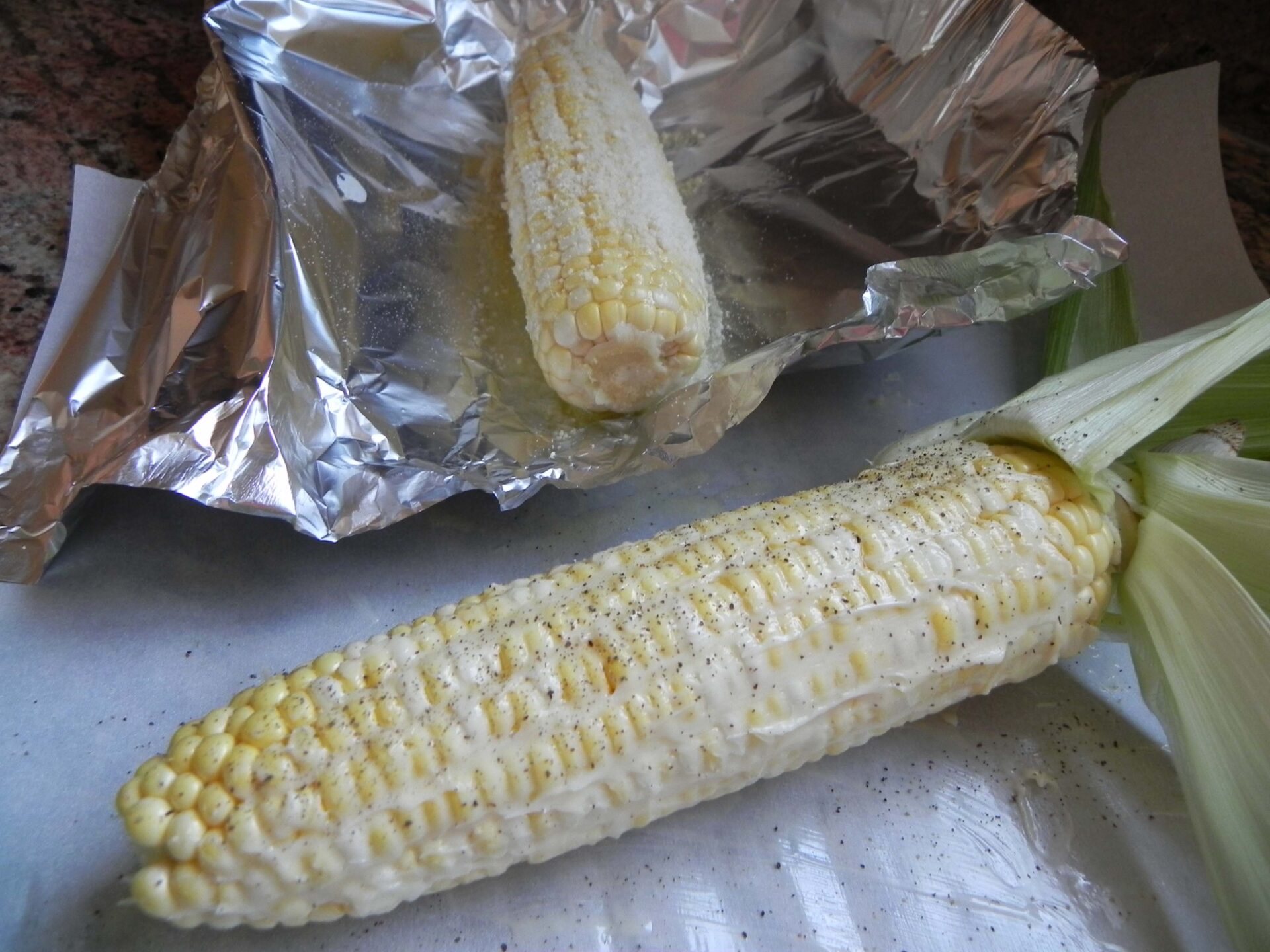 Husks removed, in foil packets: If choosing to grill the corn with husks removed, peel back and remove as much of the silk as possible by hand. Carefully scrub away any remaining silks caught between rows of kernels by using a paper towel or soft vegetable brush, using a downward motion from tip to base. Pat the corn dry. Trim the knobby protrusion remaining at the base of the cob. Place each ear of corn on a rectangular sheet of aluminum foil. Drizzle with somewhat cooled melted butter and season with optional spices or grated Parmesan cheese. Tent the foil over the corn and twist the ends closed. Place each foil packet on the top rack of the grill for about 20-25 minutes, with lid closed. Carefully open foil packets (steam will escape) and serve.