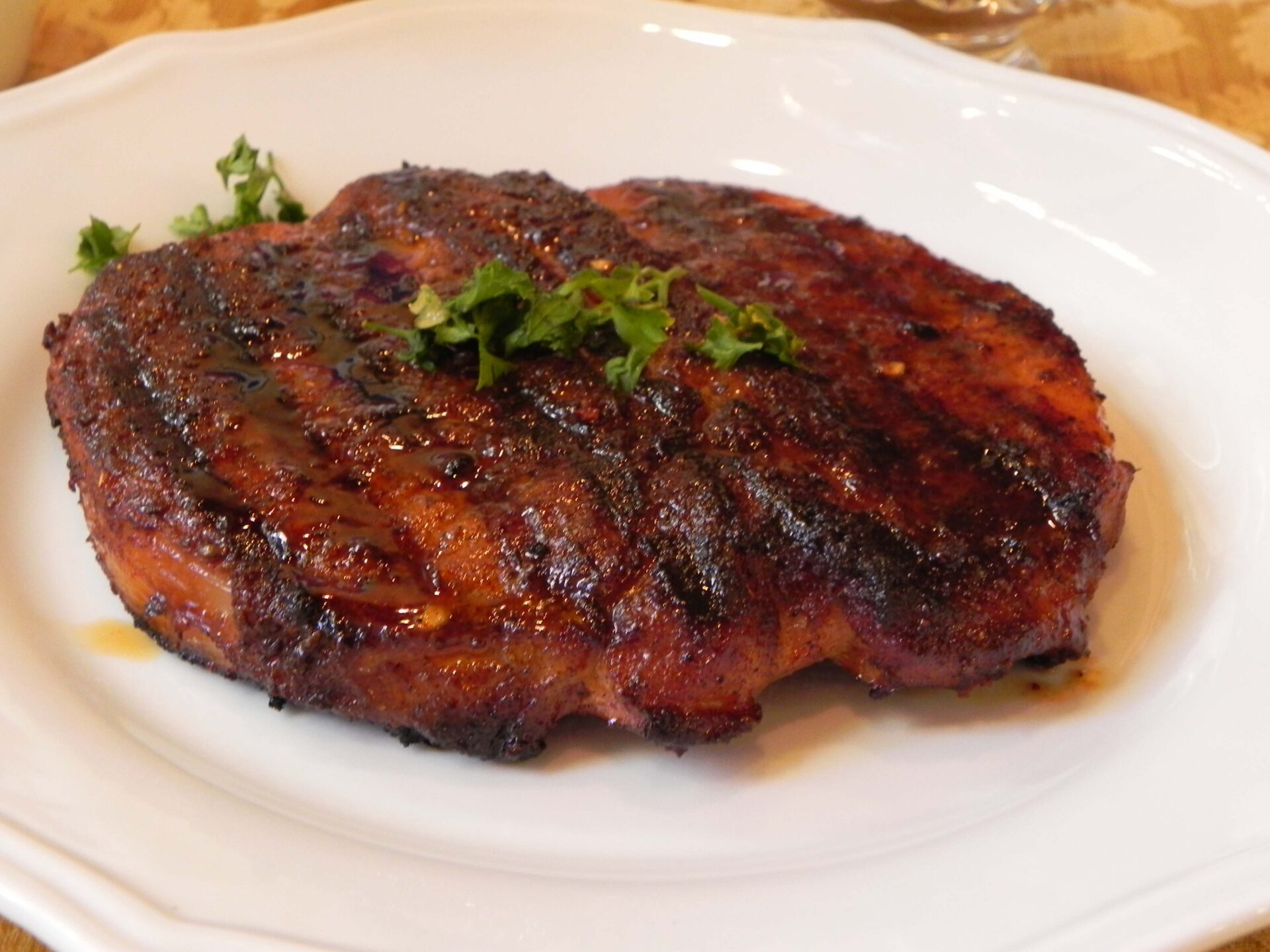 chop-DSCN8332This recipe is well worth planning ahead. The chops need to age in the rub before grilling. Ideally, they should be grilled outdoors, but I grilled mine on a well seasoned cast-iron stove-top grill, using a heavy lid from a larger skillet to cover the grill skillet. The burner on my gas stove was set to medium-high.