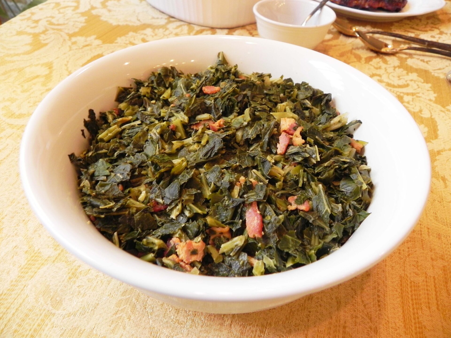 collards-DSCN8345Collards cooked alone can be bitter and a bit tough. This is a veggie that requires thorough cooking to tenderize the greens. Old-fashioned Southern cooks used to add a pinch of sugar with the cider vinegar to neutralize any bitter taste. We’ve omitted the sugar.