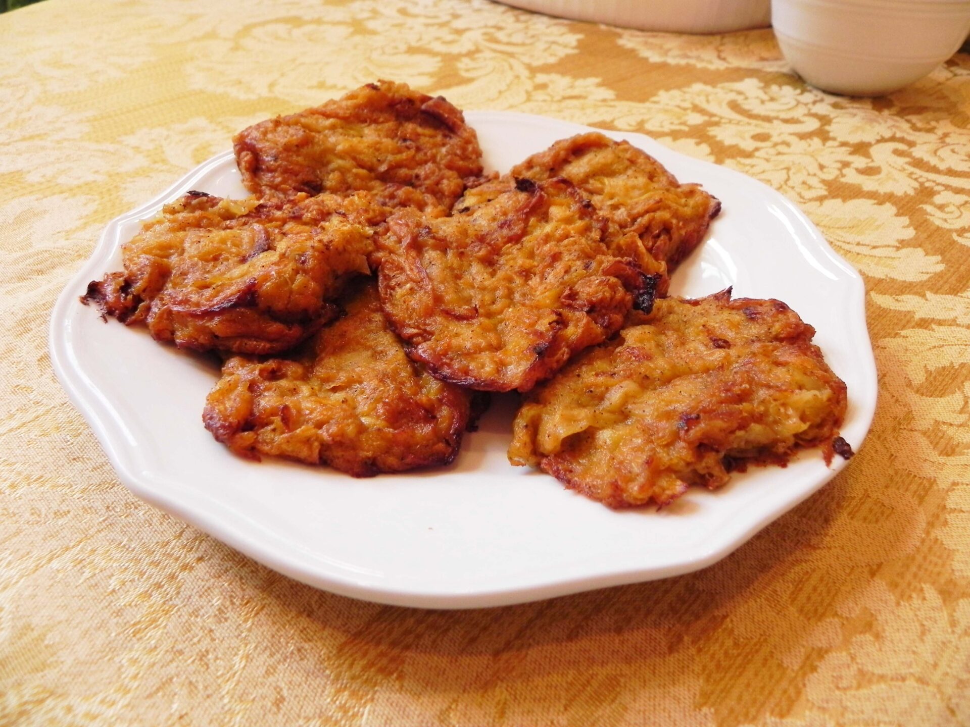 Scoop a half-cup measure of mixture and squeeze out excess moisture, forming a ball. Position fritters on the cookie sheet, pressing lightly to flatten. Repeat until six patties have been positioned on sheet. Bake for about 25 minutes. Remove tray from oven. Carefully flip the patties, using two spatulas to prevent breakage. Push excess liquid on tray back into edges of each patty. Bake for 15-20 more minutes, until browned.