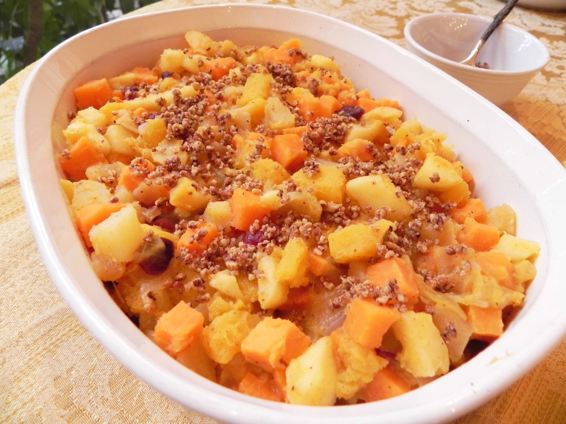 fruits&veggies-DSCN8340This dish was a happy accident that occurred when I commingled two recipes after several interruptions. It had started off as a fall squash interpretation of the traditional Jewish Tsimmes made with carrots, sweet potatoes and fruit. The happy accident took the dish into Bubba-land when I added the apples and pears to onions sautéed in bacon drippings. What the hey, I thought. I’ll add some wine and make the sweet more savory. … Turned out so fine that I plan to serve this dish at Thanksgiving.