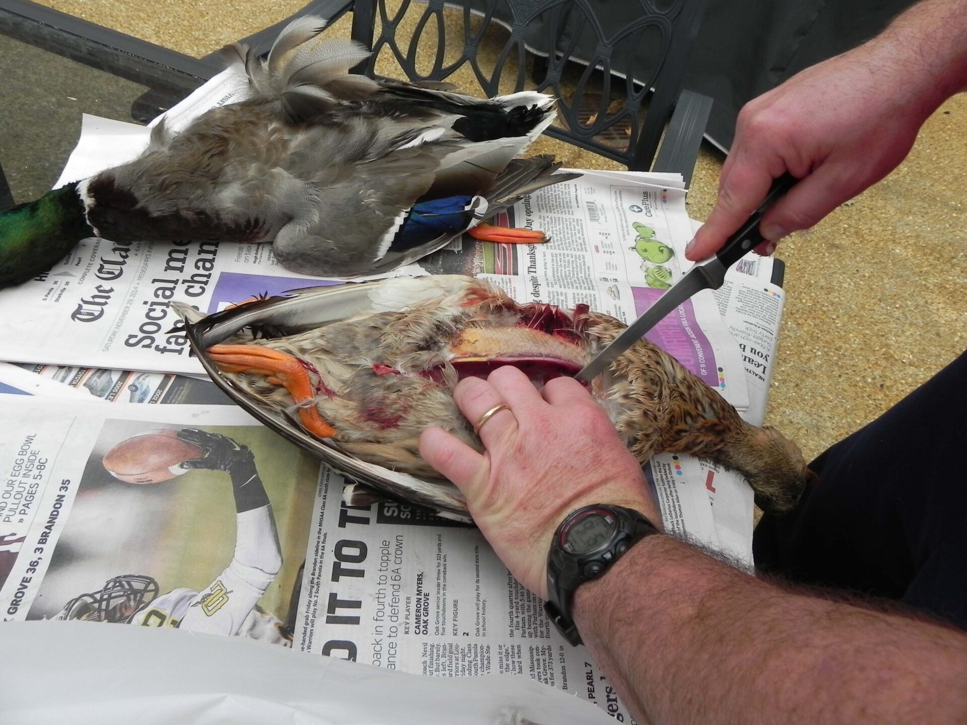 Upon learning that I’d never previously field-dressed a duck, Neighbor John assured me it would be easy. He gave me a quick verbal tutorial and suggested I check out several You-tube how-to videos. He even offered to have the lady down the road from the duck camp dress the carcasses next time. Then he headed off to The Grove for the Egg Bowl.