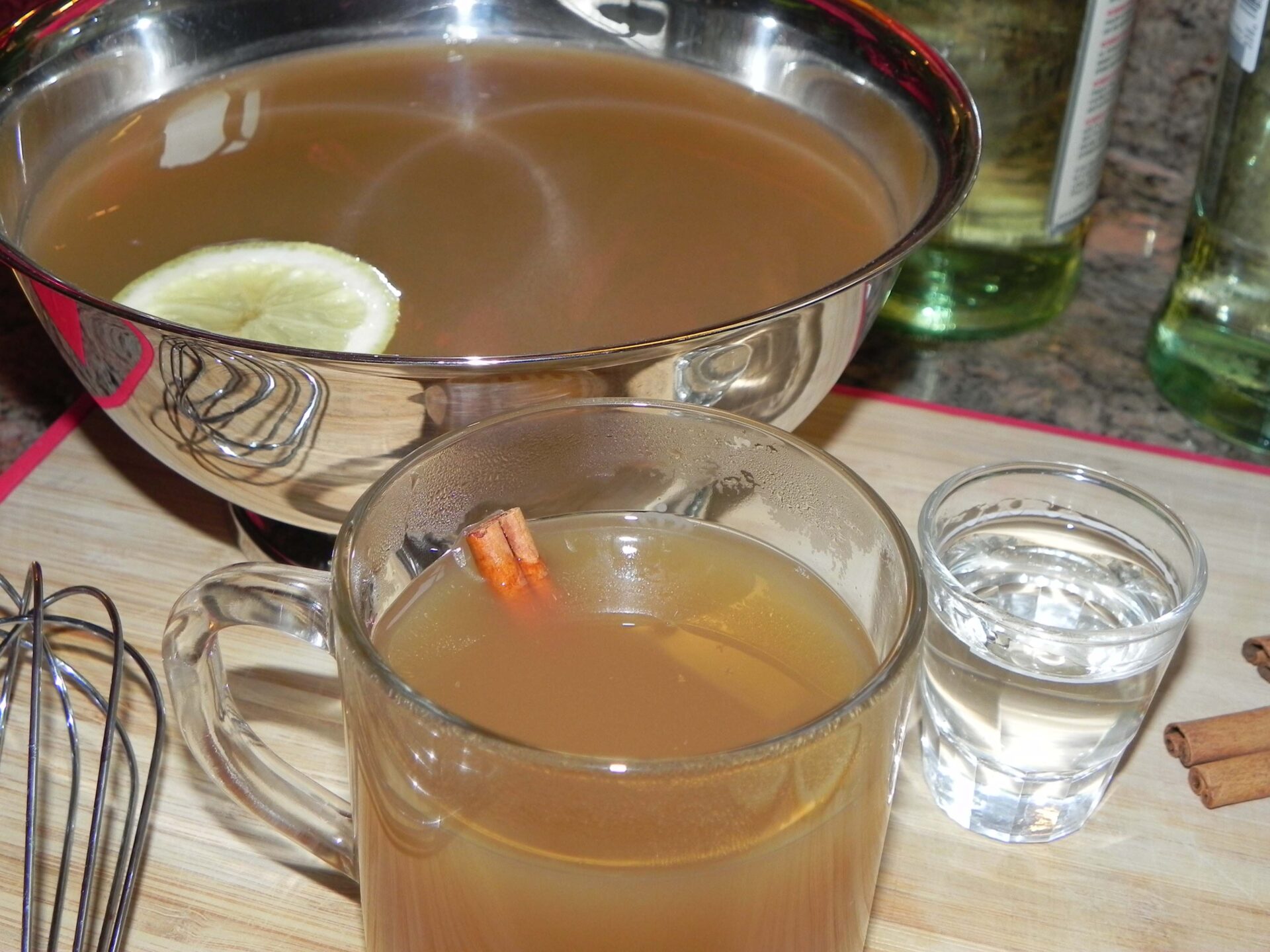 Simmer the cider, allspice, cinnamon, and cloves for 20 minutes. Whisk in the lemon juice and orange juice.
