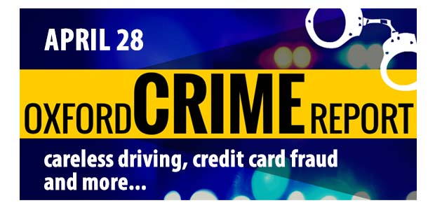 Oxford police responded to the following incidents: five disturbances, four alarms, three suspicious activities, two careless drivers, two welfare concerns, a public intoxication, a motorist assist, a 911 hang up call, an illegally parked car, a credit card fraud, an animal complaint and an ambulance assist.