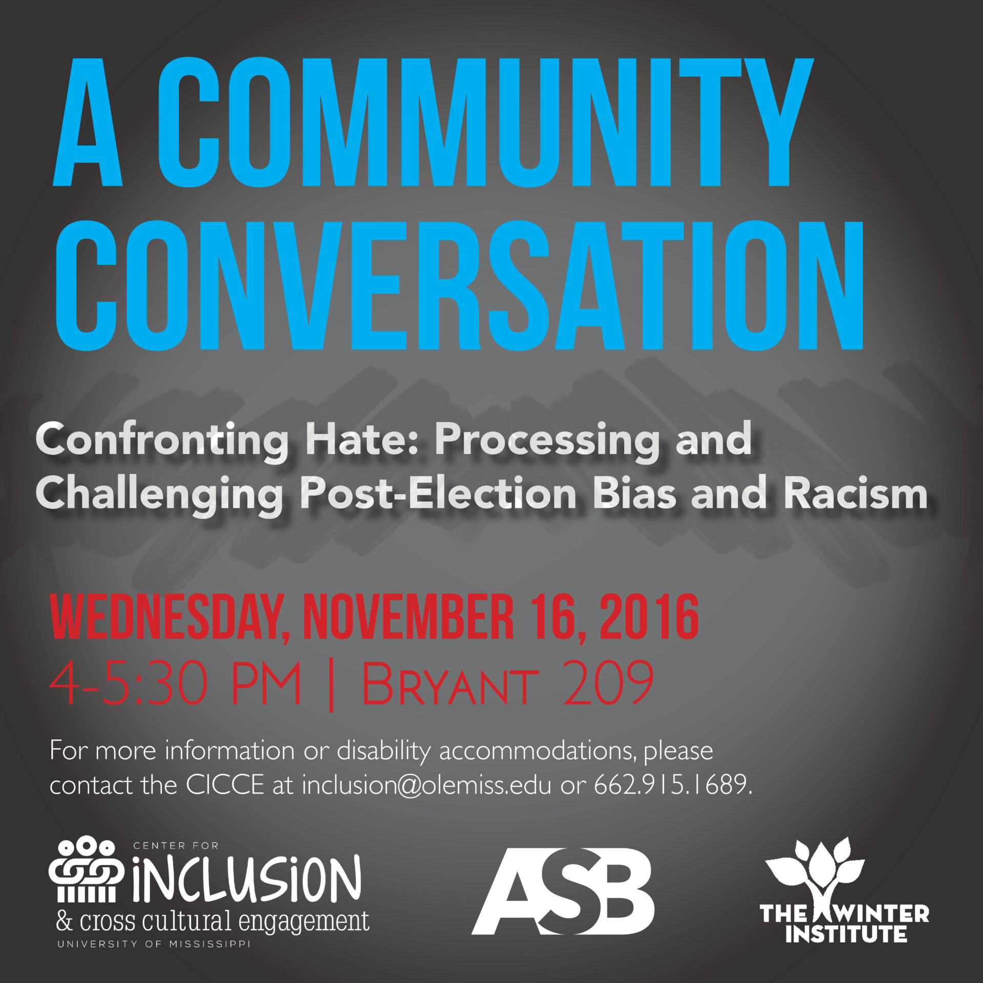 “Confronting Hate: Processing and Challenging Post-Election Bias and Racism” begins at 4 p.m. Wednesday (Nov. 16) in Bryant Hall, Room 209. The event is co-sponsored by the UM Center for Inclusion and Cross Cultural Engagement, the Associated Student Body and the William Winter Institute for Racial Reconciliation.