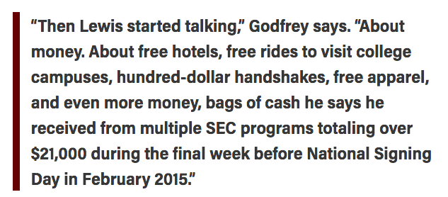 “He told the group (NCAA investigators, his lawyers, and Ole Miss lawyers and reps) he had never intended on signing with Ole Miss and that as he took the payment, he was still deciding between LSU and Mississippi State,” Godfrey says. “Lewis was then pressed by a lawyer for Ole Miss as to why he took the money.”
