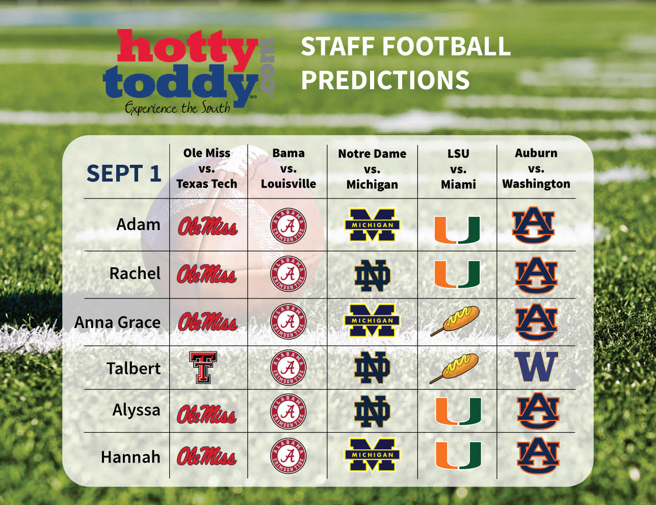 HottyToddy.com staff members are bringing a new tradition to our readers this year. We’re laying out our weekly picks on five key matchups around the country and SEC for all to see.