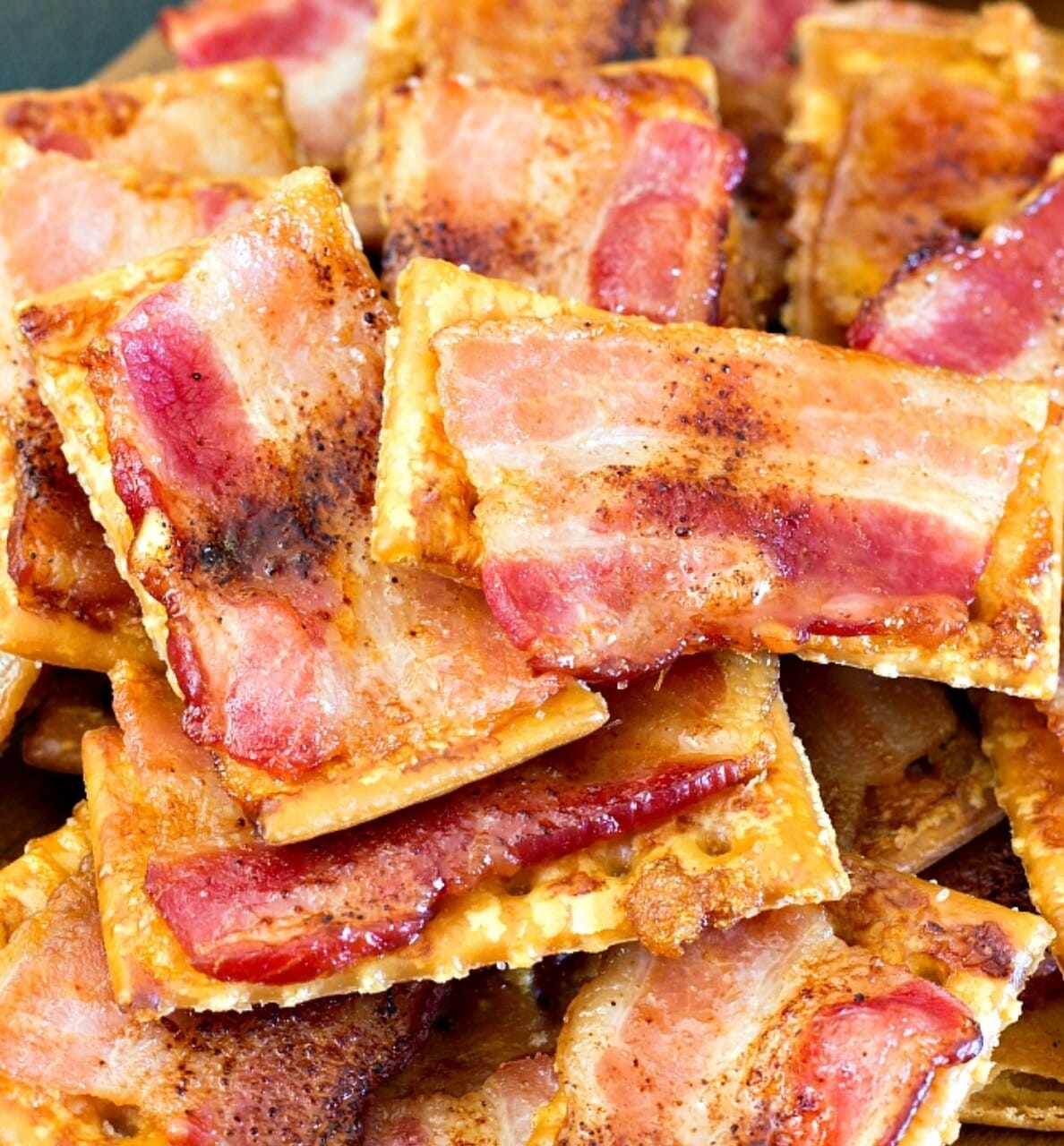 Bake 35-45 minutes until bacon is glazed, sugar is melted, and crackers are slightly browned.