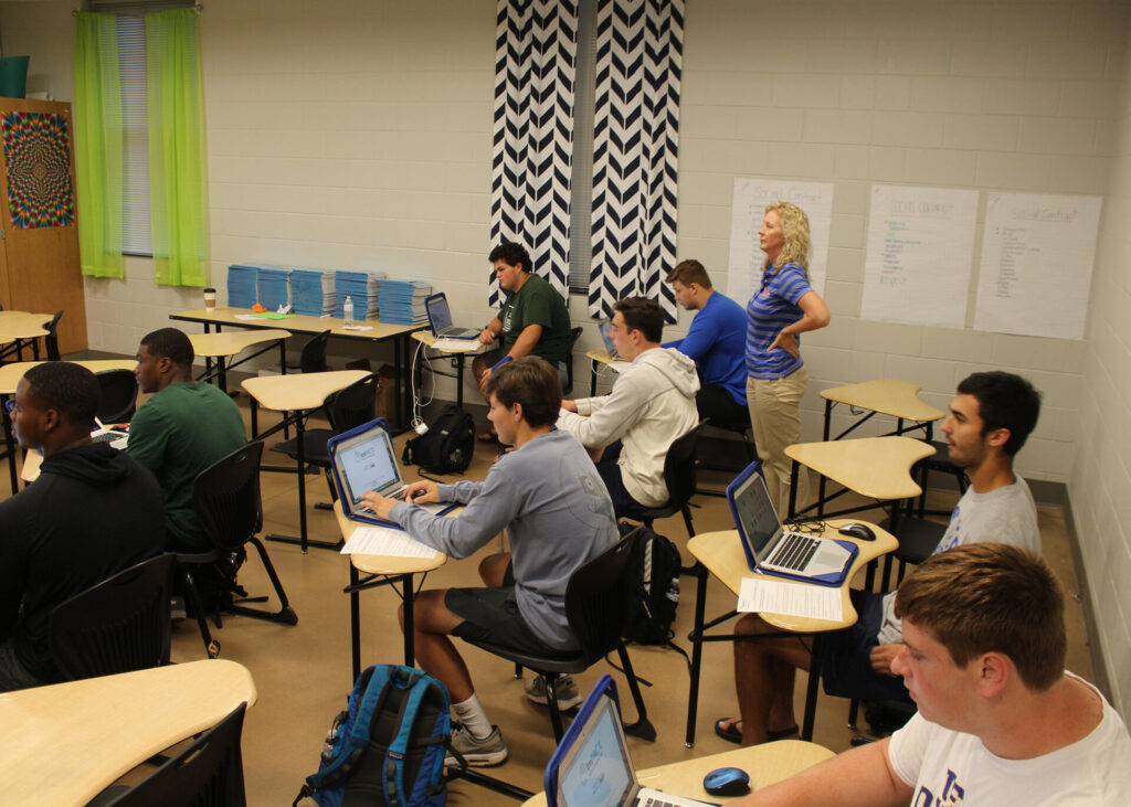 Melinda Valliant, co-director of the UM Center for Health and Sport Performance, oversees baseline concussion testing with Oxford High School football players. Photo by Sarah Sapp/School of Applied Sciences