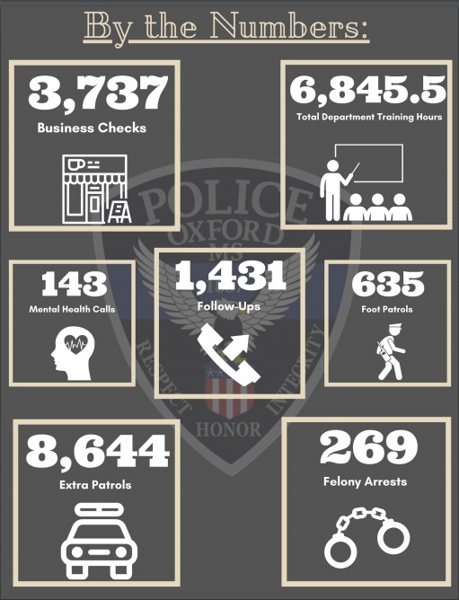 Oxford Police Department issued 17 tickets, investigated 5 accidents and the following reports: