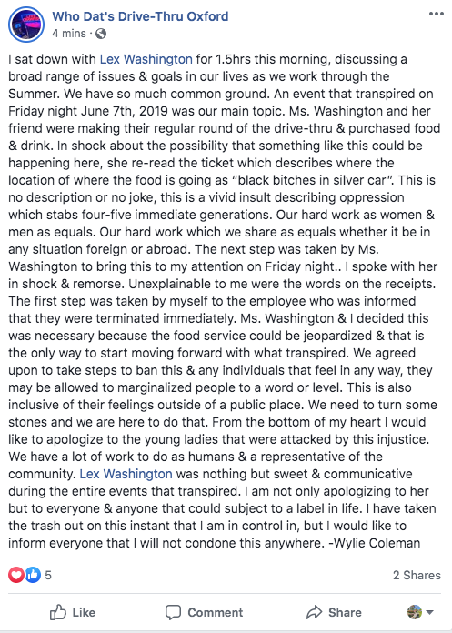 After a Facebook post by an Ole Miss graduate went viral regarding a receipt she received that stated a racist, sexist comment, Who Dat’s Drive-Thru in Oxford is in hot water with the LOU community.