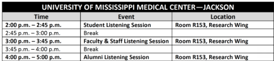The University of Mississippi Medical Center Campus Listening Sessions will begin at 2 p.m. on Wednesday, June 19, on the campus located at 2500 North State Street in Jackson.