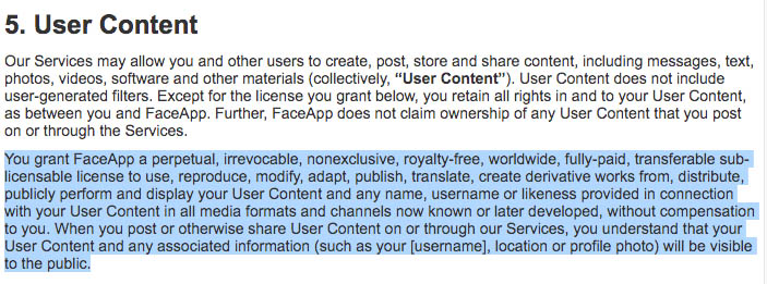 “You grant FaceApp a perpetual, irrevocable, nonexclusive, royalty-free, worldwide, fully-paid, transferable sub-licensable license to use, reproduce, modify, adapt, publish, translate, create derivative works from, distribute, publicly perform and display your User Content and any name, username or likeness provided in connection with your User Content in all media formats and channels now known or later developed, without compensation to you. When you post or otherwise share User Content on or through our Services, you understand that your User Content and any associated information (such as your [username], location or profile photo) will be visible to the public.”