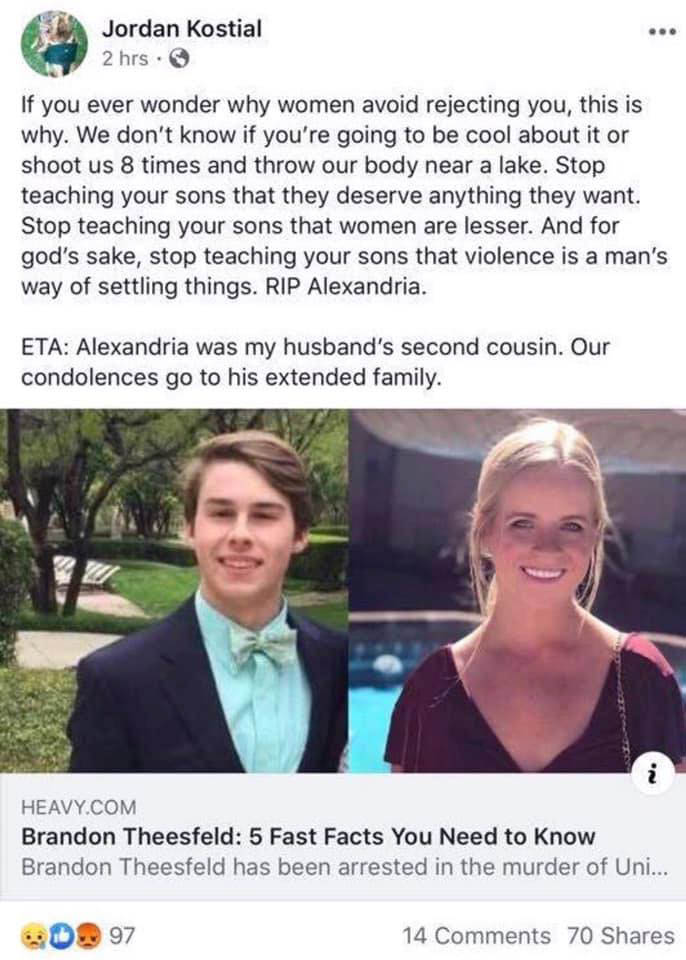 Late last night, Jordan Kostial, a family member of the victim, alluded on Facebook that Theesfeld acted out because Kostial rejected him romantically.