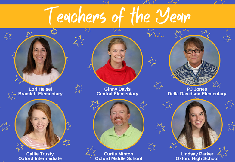 The 2020-2021 Oxford School District Teachers of the Year being honored are Lori Helsel, Bramlett Elementary; Ginny Davis, Central Elementary; PJ Jones, Della Davidson Elementary; Calla Trusty, Oxford Intermediate; Curtis Minton, Oxford Middle; Lindsay Parker, Oxford High.