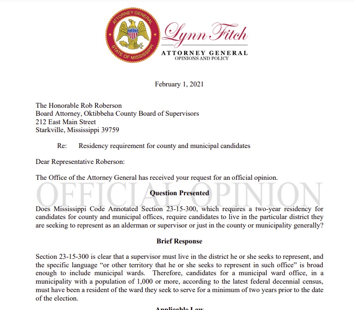 The Mississippi Secretary of State’s Office had interpreted the state statute to mean that a candidate must live in the city or municipality for two years, but not necessarily the Ward in which they were running for office.