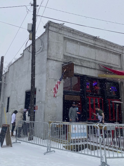 UM students (from left) Emelia OโNeill, Claire Watkiss and Nicole Cotlar take photos to capture Oxfordโs first snow.