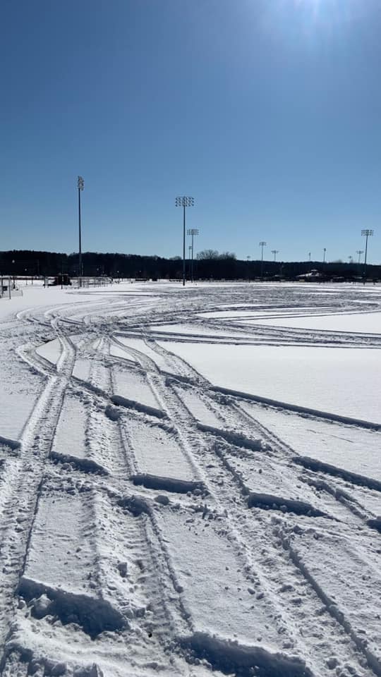 The driver did “donuts” on the fields, causing damage to the grass below the snow.