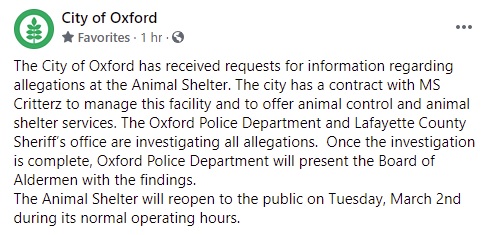 Prior to announcing the shelter will open its doors back up to the public, the post noted that there was an open investigation by the Oxford Police Department and the Lafayette County Sheriff’s Department.