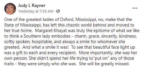 In lieu of flowers, those who wish to honor Khayat’s life may donate to the Margaret Denton Khayat Ole Miss Womenโs Council Scholarship online at https://umfoundation.com/mkhayat.
