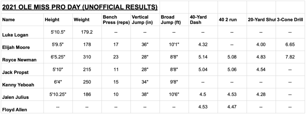 Ole Miss football held its annual Pro Day on Thursday inside the Manning Center as ten players showcased their talents in front of NFL scouts.