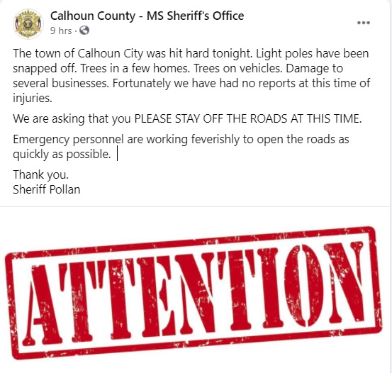 “Theย town of Calhoun City was hit hard tonight. Light poles have been snapped off. Trees in a few homes. Trees on vehicles. Damage to several businesses. Fortunately, we have had no reports at this time of injuries,” Calhoun County Sheriff Greg Pollan said in a Facebook post.
