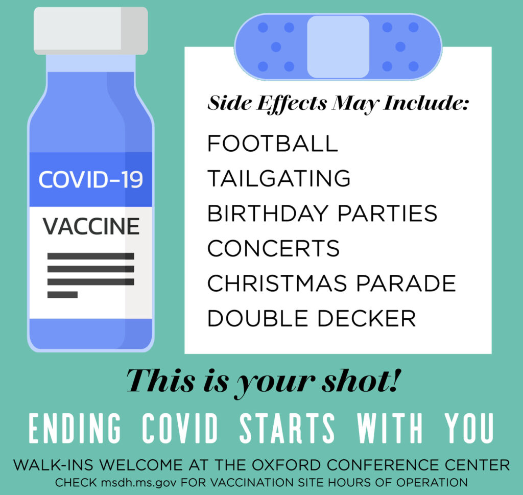 Vaccinations are available at most pharmacies and medical clinics in Oxford. While the National Guard Armory/Oxford Conference Center was once a MSDH drive-thru site, it is now a walk-in site that does not require appointments.