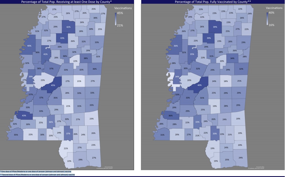 Yalobusha County also has 39 percent of its population fully vaccinated and 43 percent have at least one shot.