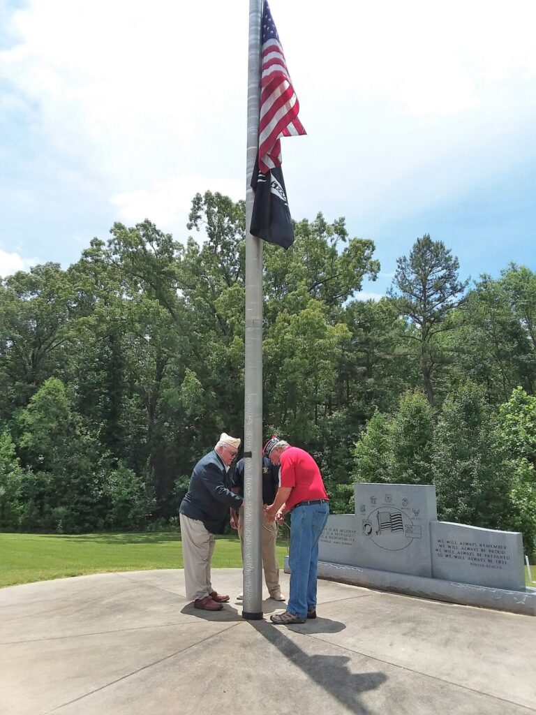 Commanders of Lafayette County veteran associations, Ray Wilburn of DAV, Gregory Lovelady of VFW and Dennis Bullard of American Legion raise the flag.