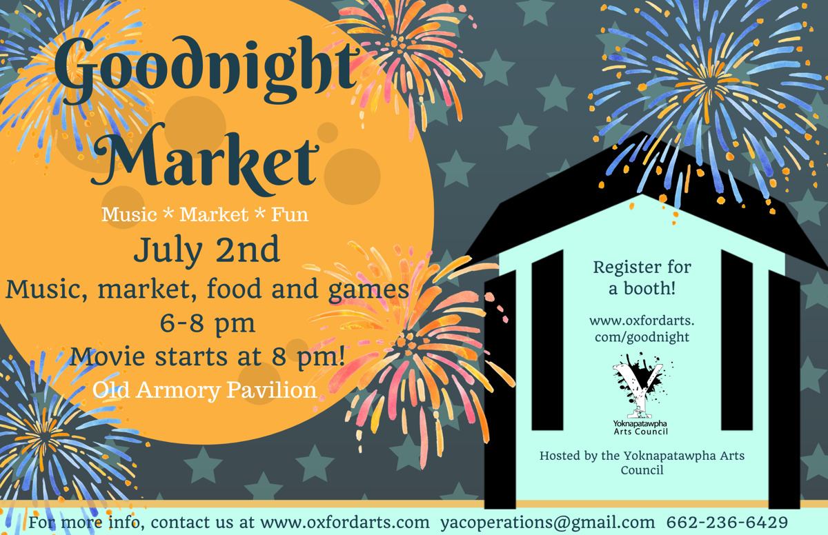 On July 2, the Yoknapatawpha Arts Council will host a Goodnight Market event at the Old Armory Pavilion from 6-8 p.m. There will be free hot dogs, live music, games and local vendors.