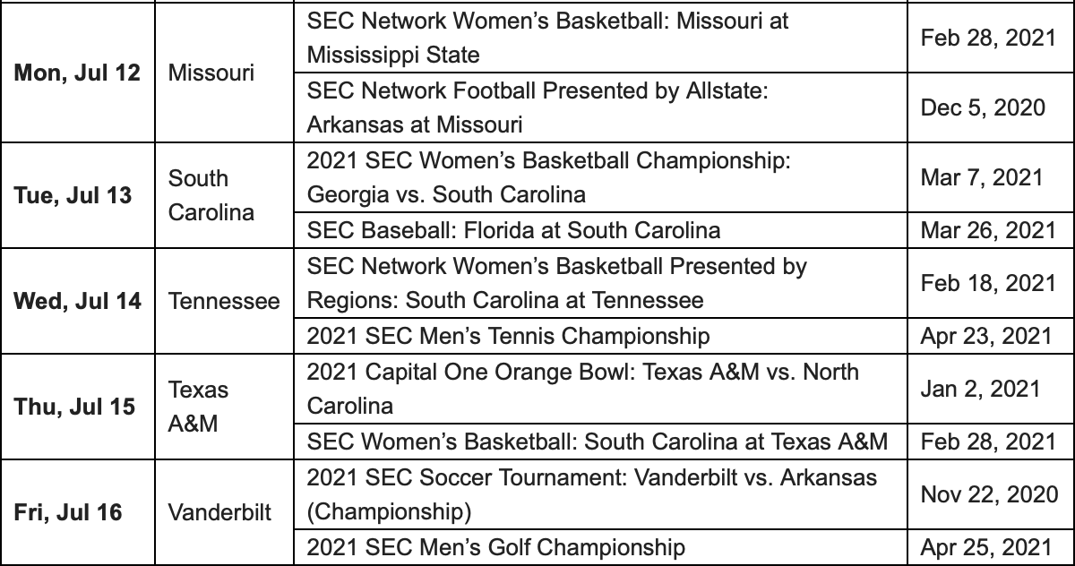 During the two-week take over fans will be able to watch SEC Championships, SEC Storied films, regular-season showdowns, spring football, SEC Network original programming and more.