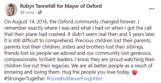 Five years ago Oxford was stunned and saddened by the news of a downed airplane with six Oxonians on board.