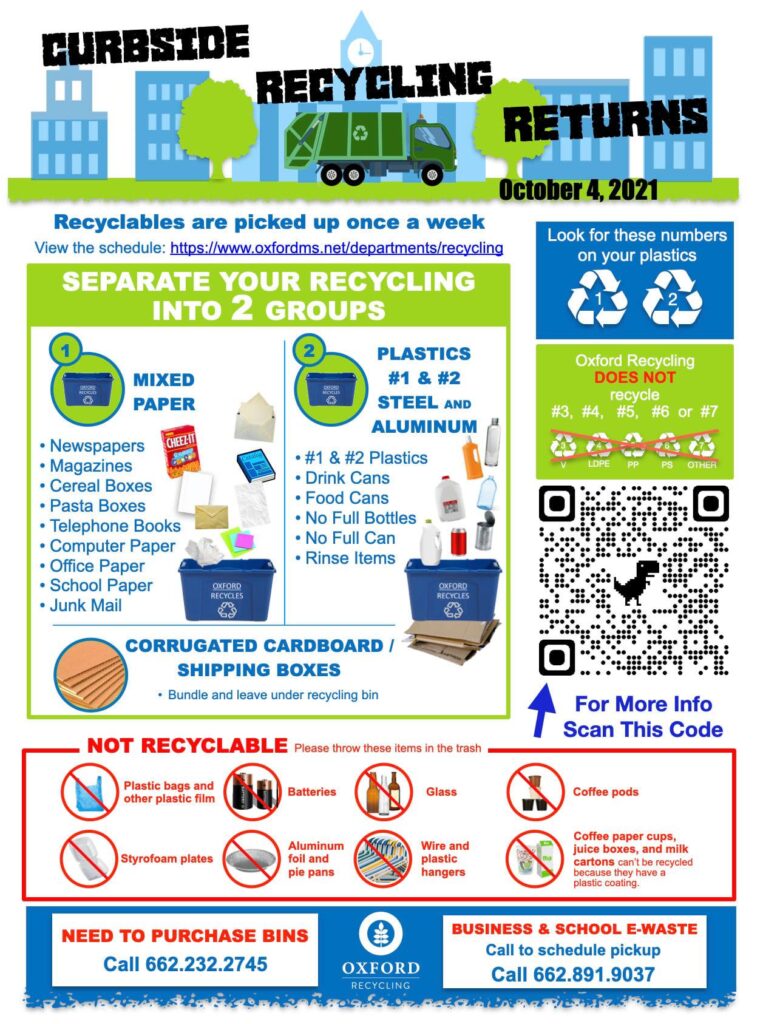 The city of Oxford will be offering curbside recycling once again starting the first week of October, announced Mayor Robyn Tannehill recently.