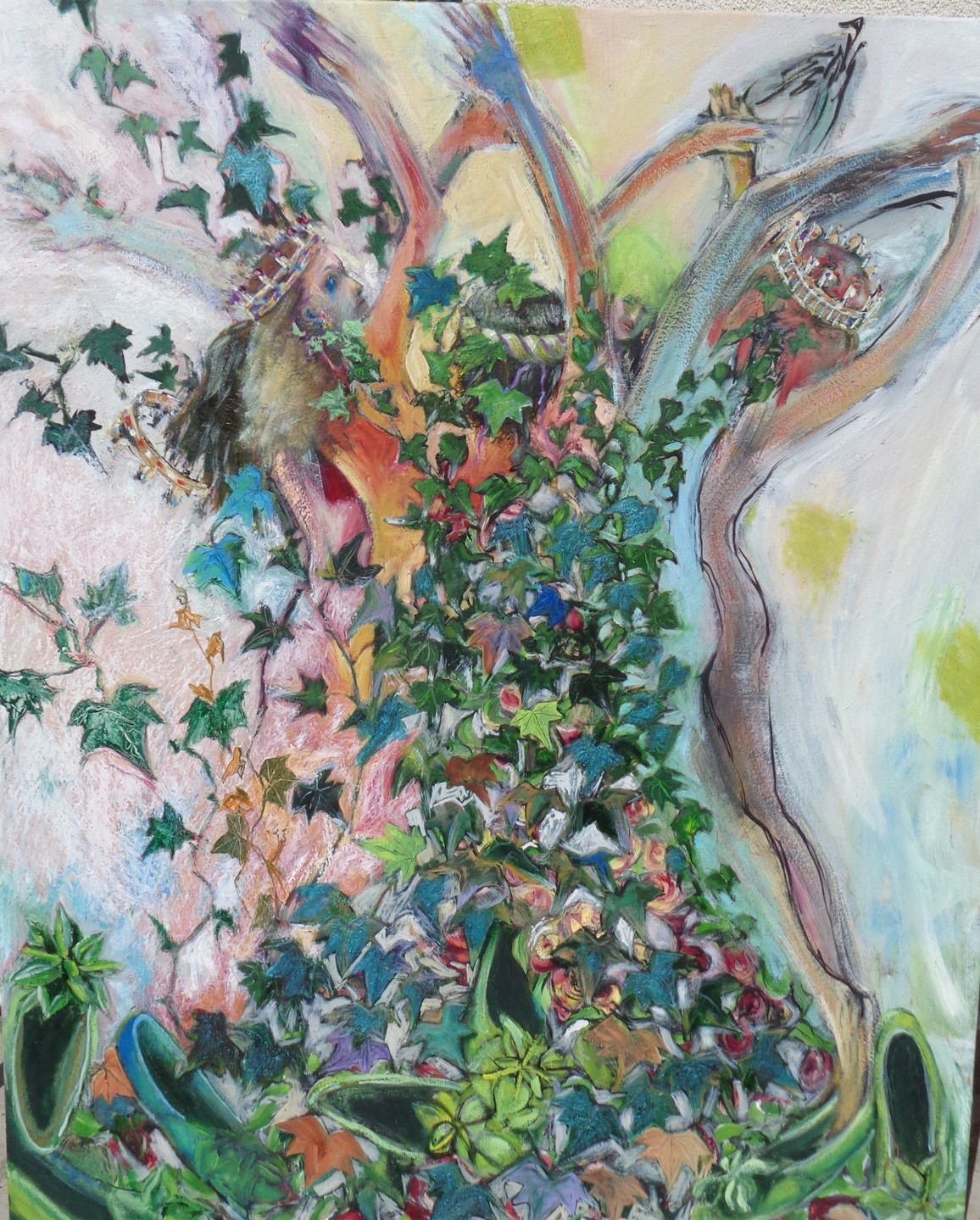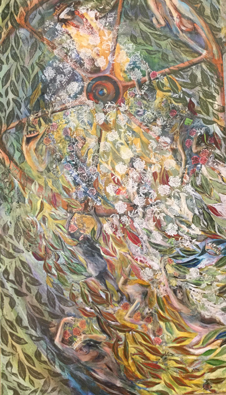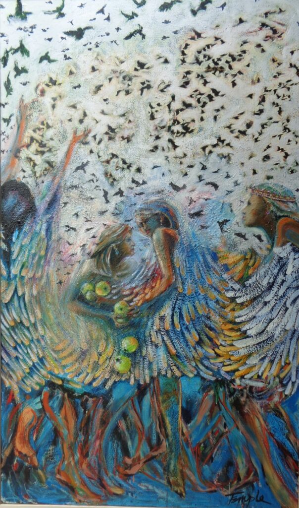 The layering of new ideas and better skills on the older, playful images is a revelation. Some favorites are, a large triptych piece called Rapping at My Window, Tapping at My Window Saying Let Me Come In. This is a three-part, (triptych) oil on canvas first exhibited in the University Museums around 1991. It was a precursor to the piece Light, Grace, and Spirit I did for the American Cancer Society. Fortuna, I did for a Salonista project (my Paris salon group). It is about the goddess of fortune spinning her wheel as many fall off. I think it may be on my website. Cissos is also a painting from my Greek legend series. The Bird Watchers, The Storks Nest (La Nid de la Cigoyne), and Red Handed Greeting are very recent paintings from the Figurative and Nature series, are among favorites. Some of these are on my website, www.paulatempleart.com.