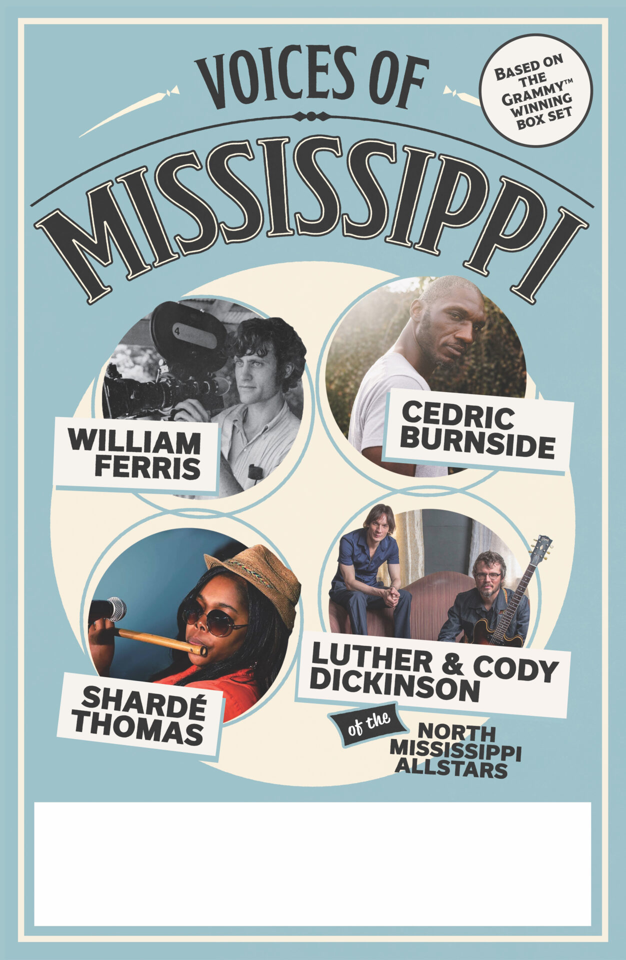 Featured musicians include Cedric Burnside, recent recipient of the prestigious National Heritage Fellowship from the National Foundation of the Arts; Sharde Thomas, and Luther and Cody Dickinson of the North Mississippi Allstars, all of whom are descendants of artists documented by Ferris.
